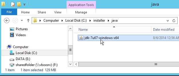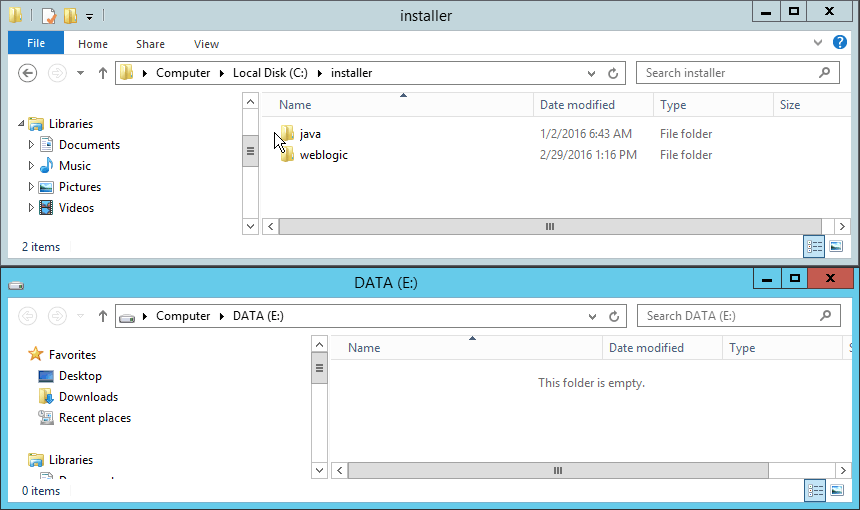 Fig. 001 Installers located in C:\installer. We have installer for java and weblogic (from Fusion Middleware 12.1.3). Weblogic will be installed on drive E: