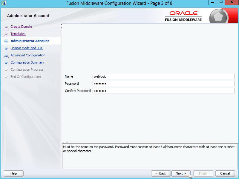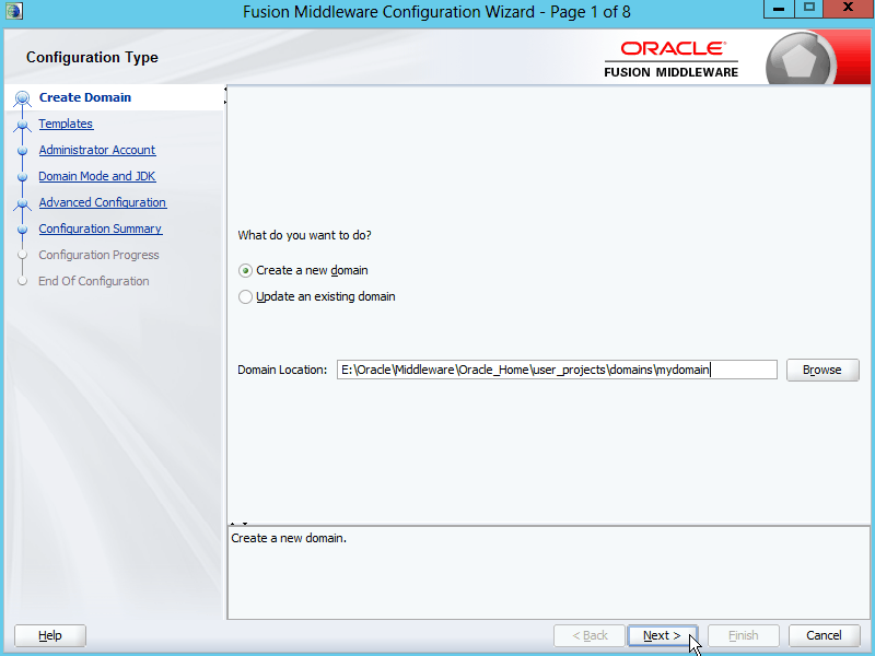 Fig. 020 Select "Create a new domain". Specify the desired directory for Domain Location