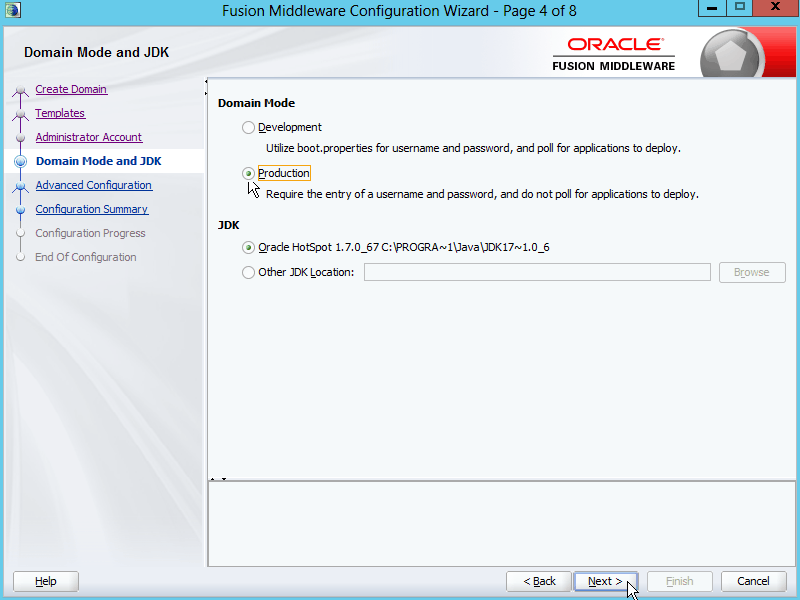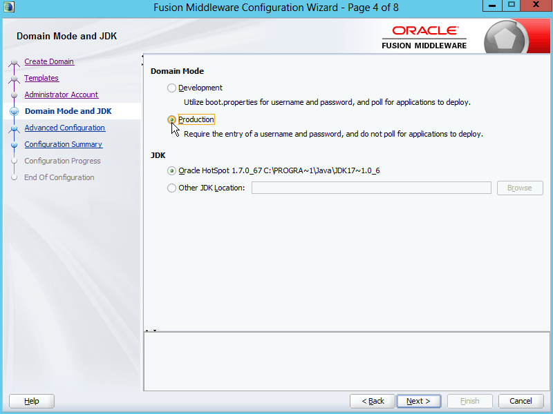 Fig. 023 For Domain Mode, select Production. For JDK, it will default to the java used to launch this installer, select as required. Must be JDK instead of JRE