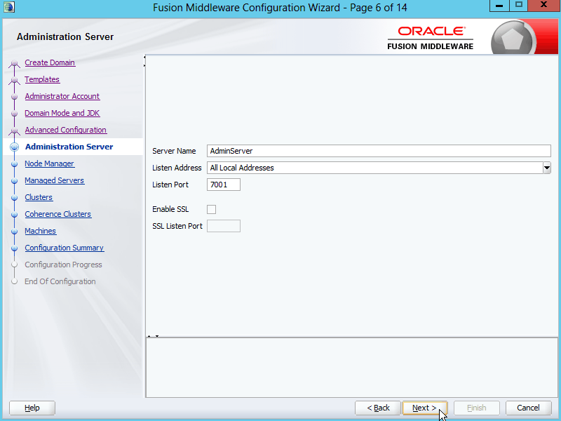 Fig. 026 For Administration Server, specify the Server Name, Listen Address and Listen Port. Click Next