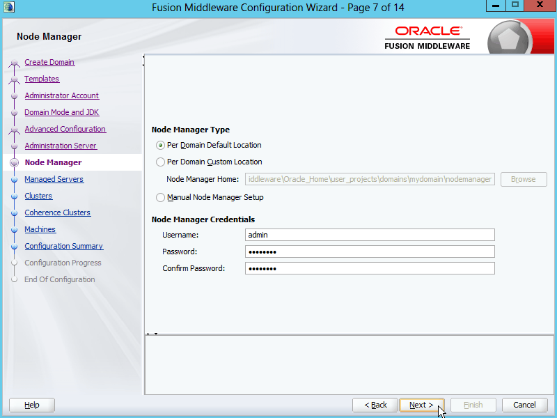 Fig. 027 Leave the Node Manager Type selection as Per Domain Default Location and enter the username and password for the Node Manager