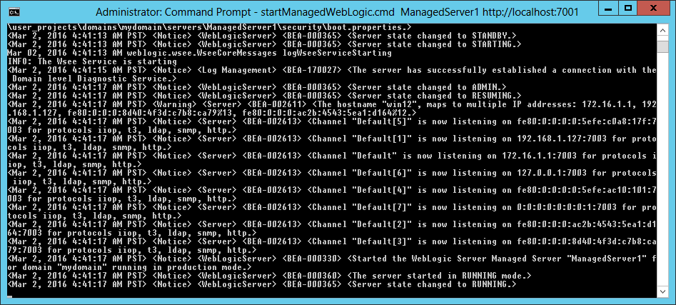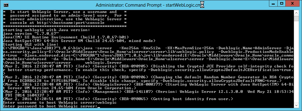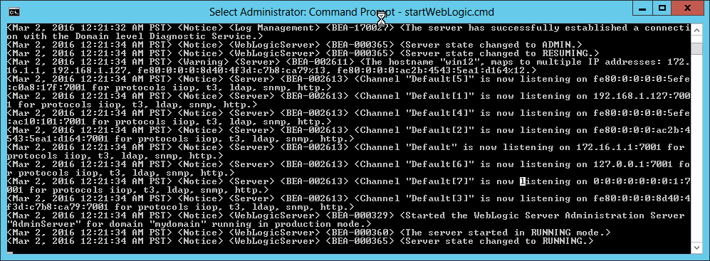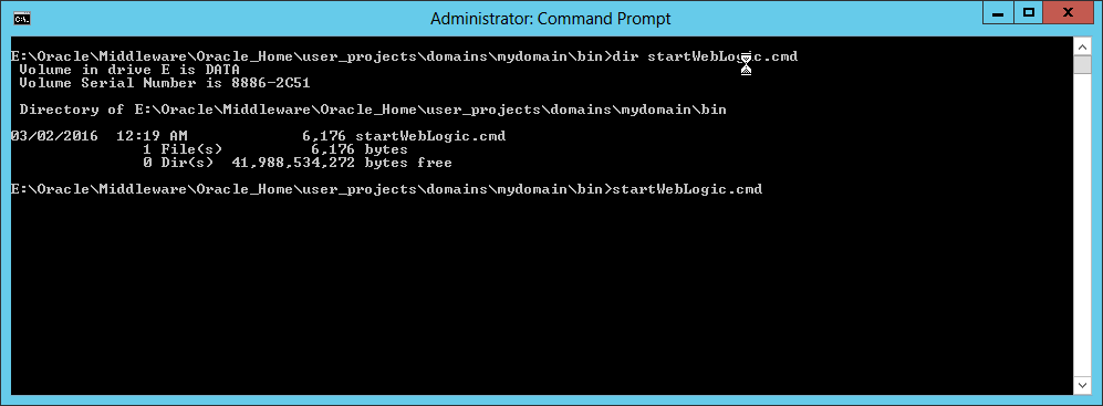 Fig. 046 Go back to the domain bin directory and start the administration server by running startWeblogic.cmd