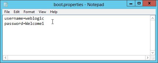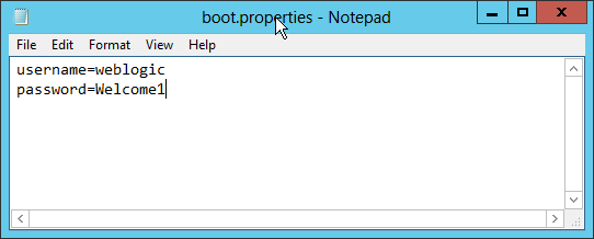 Fig. 055 Enter the plain text username and password in the format shown. Use your actual username and password in place of weblogic and Welcome1. Save and exit notepad