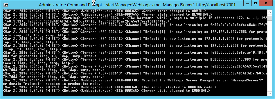 Fig. 057 Ensure the managed server Managed1 starts up completely and enter RUNNING state without being prompted for username and password