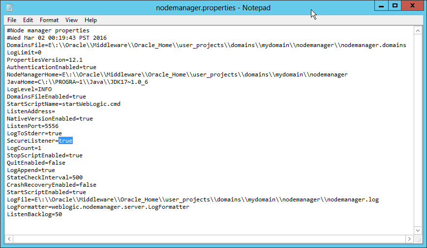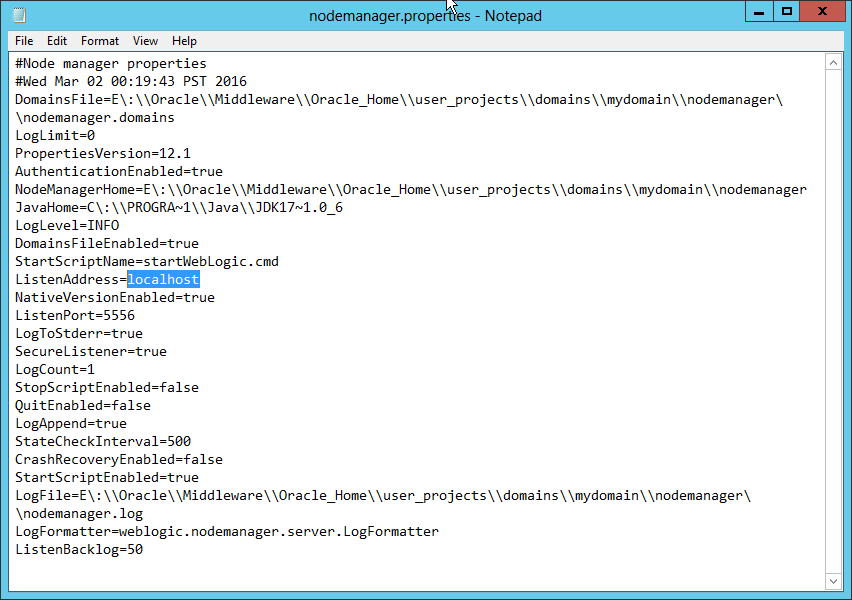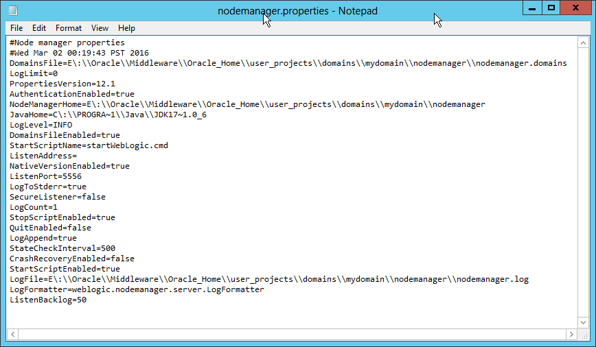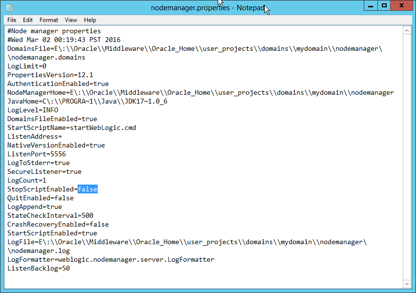 Fig. 092 At the top section of the script, define the values for NODEMGR_HOST, NODEMGR_PORT, WL_HOME, NODEMGR_HOME, JAVA_HOME. It was found that the JAVA_HOME value should not contain spaces, not even when enclosed within double quotes "". e.g. for C:\Program Files\Java\jdk1.7.0.67 shorten Program Files as Progra~1