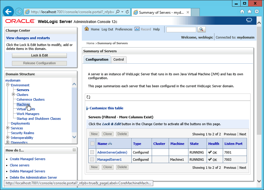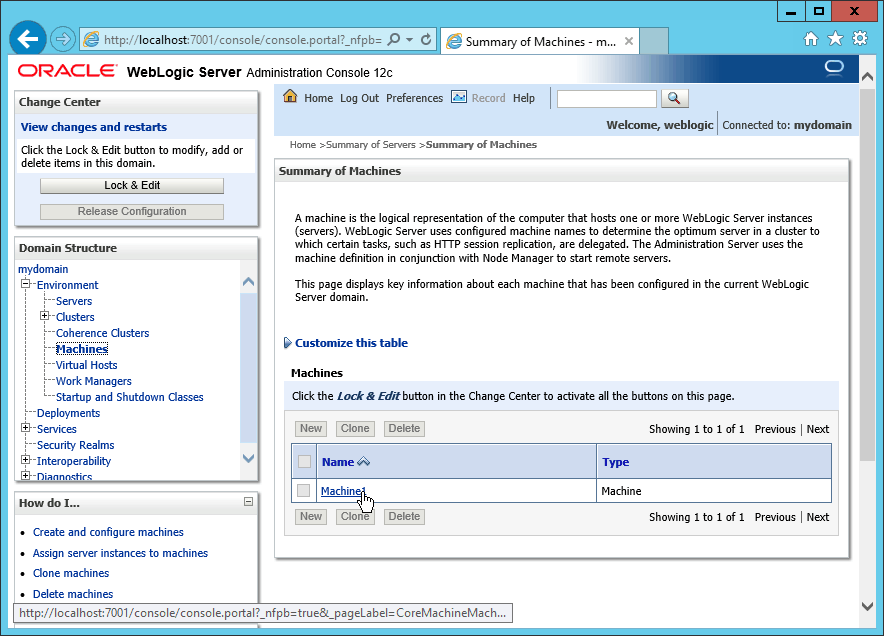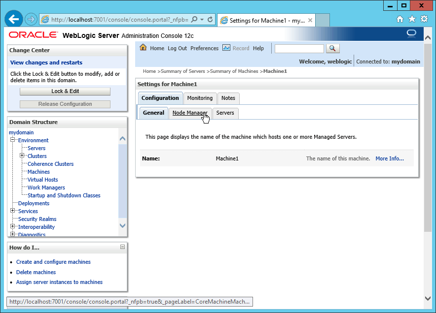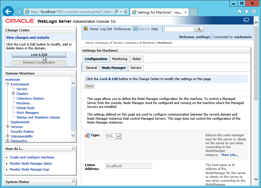 Fig. 085 Click Lock & Edit to let us change the node manager properties defined in the admin server.