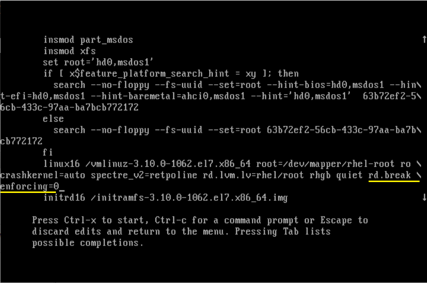 Add a space and then single selinux=0 to the end of the line, then press Enter to accept the changes