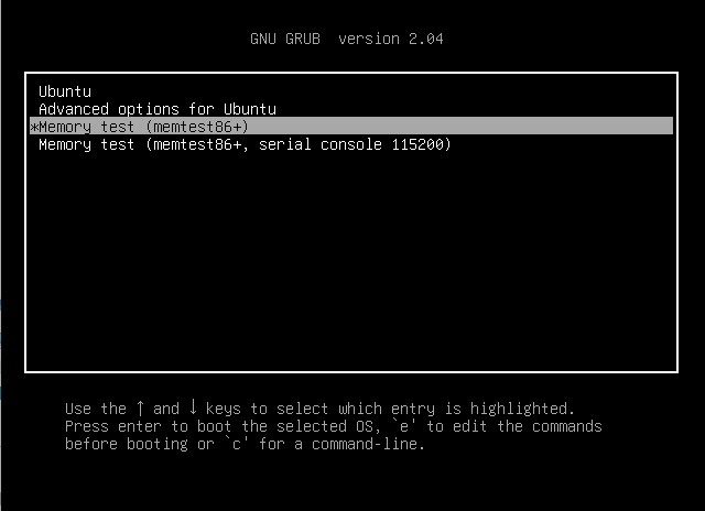 Ubuntu 20.xHold SHIFT button while rebooting until the following GRUB menu is presented. Select Memory test (memtest86)
